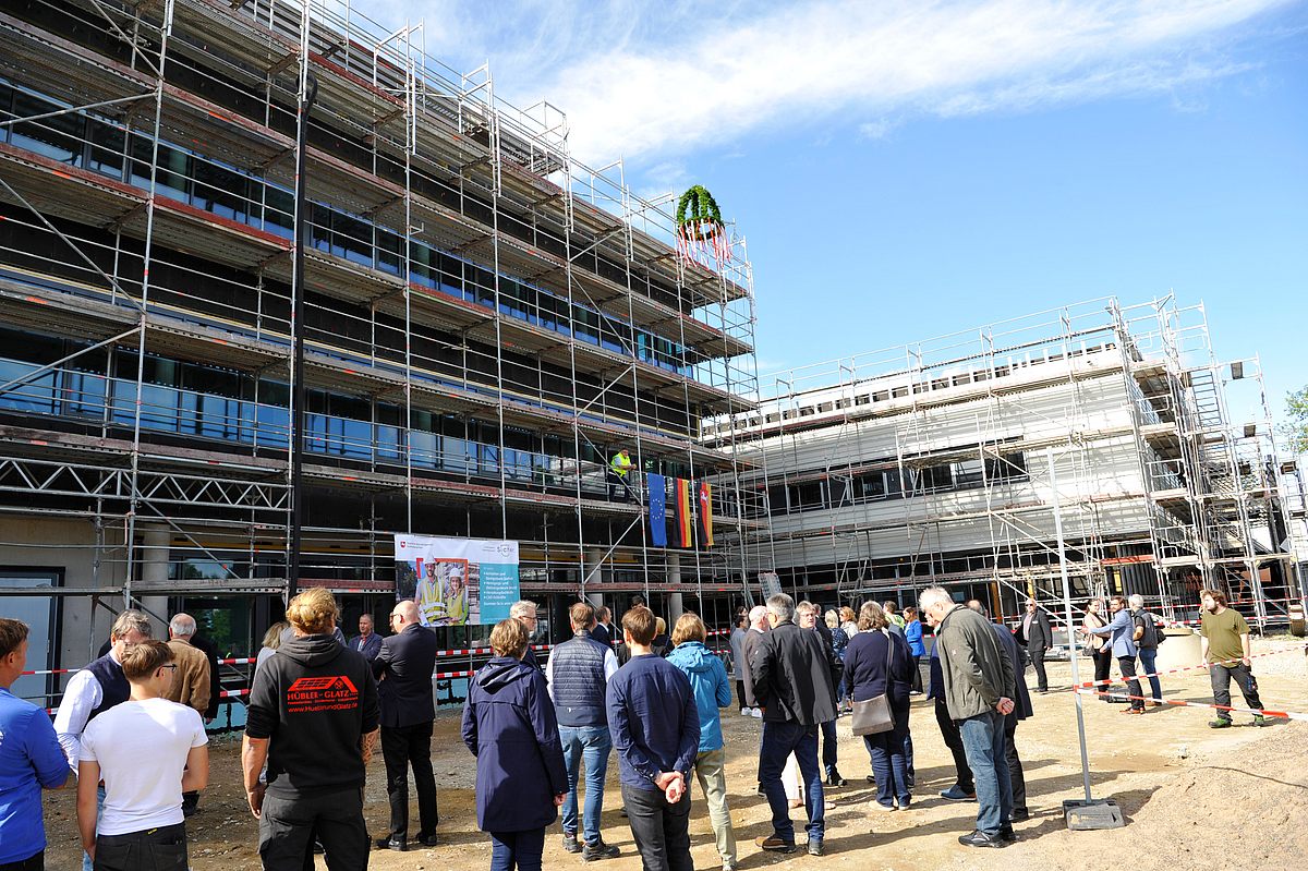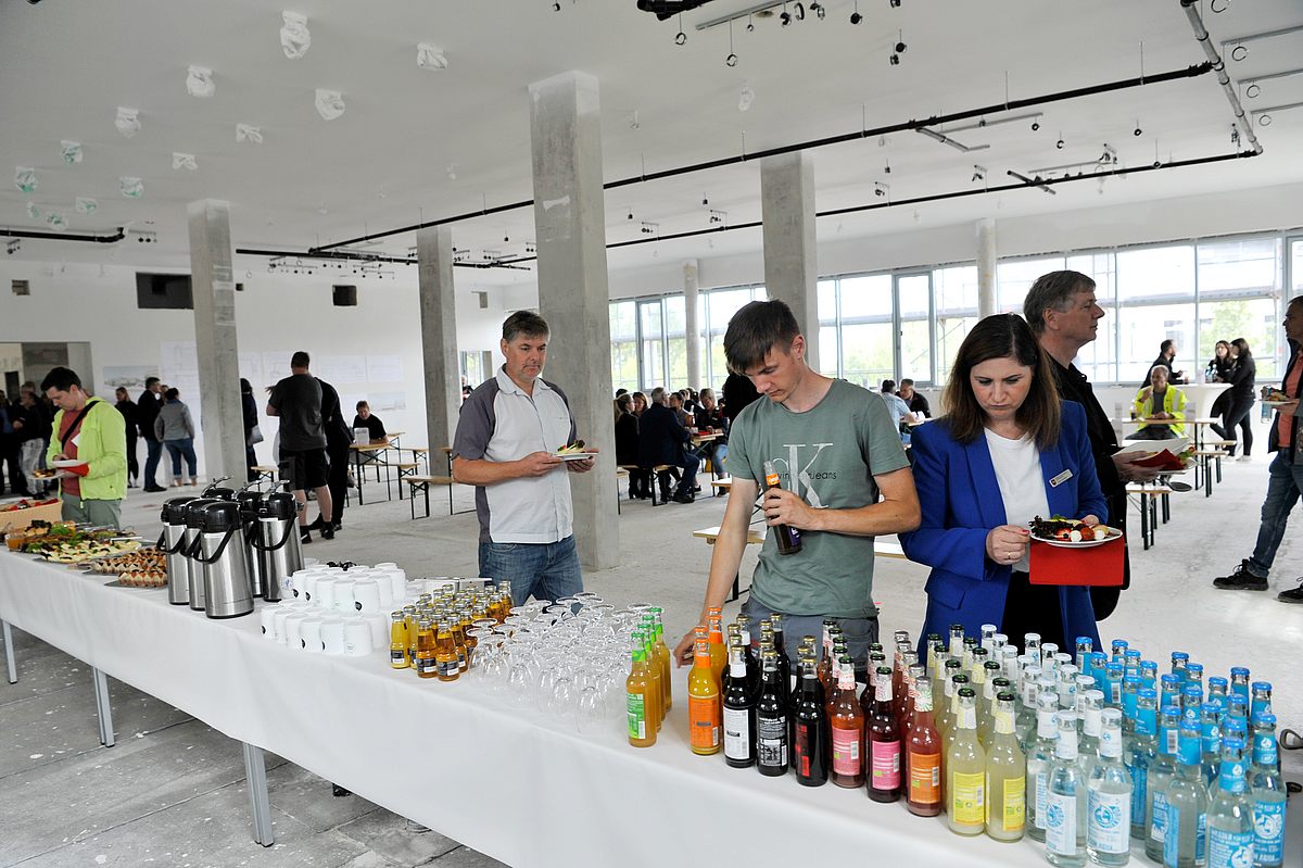 Nach dem traditionellen Richtfestspruch waren alle Gäste, darunter auch zahlreiche Politikerinnen und Politiker der Region, sowie die anwesenden Handwerkerinnen und Handwerker zu einem Imbiss im Rohbau eingeladen. Rund 40 Firmen haben sich bisher in die Baumaßnahme eingebracht.